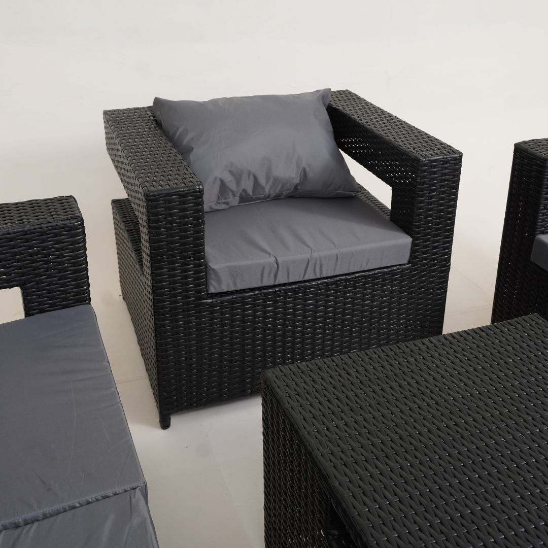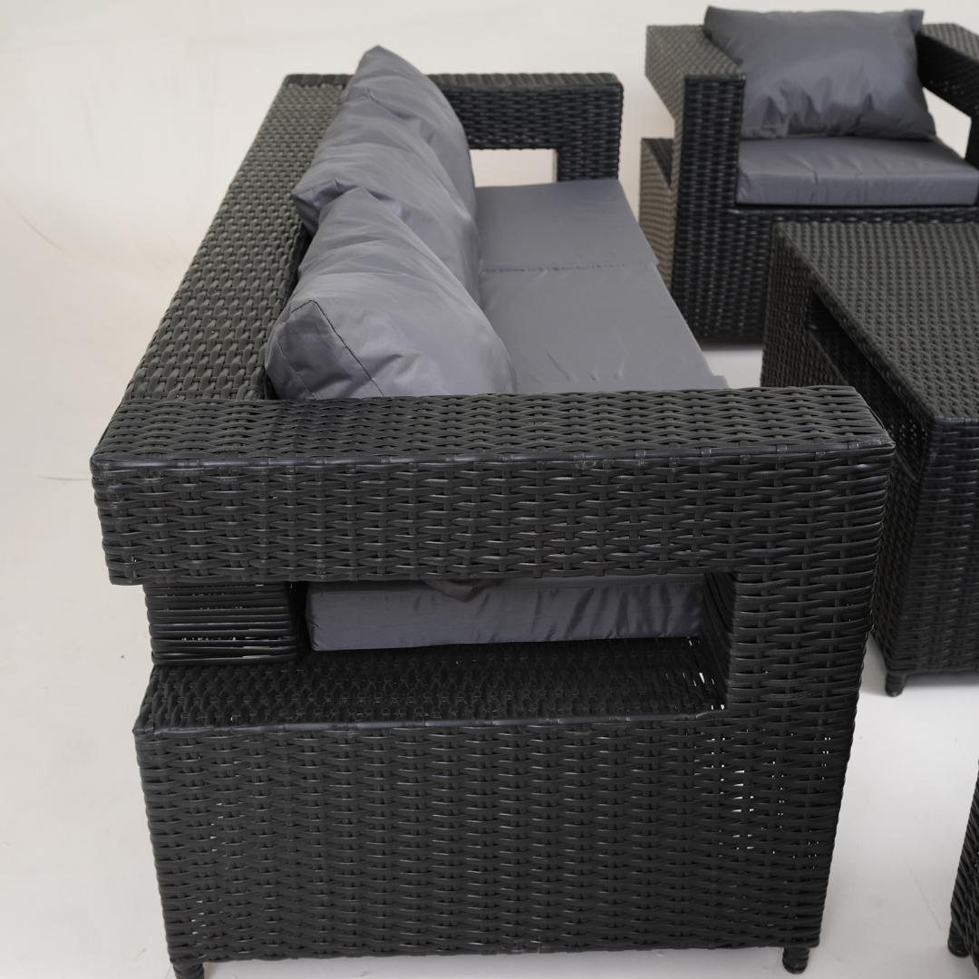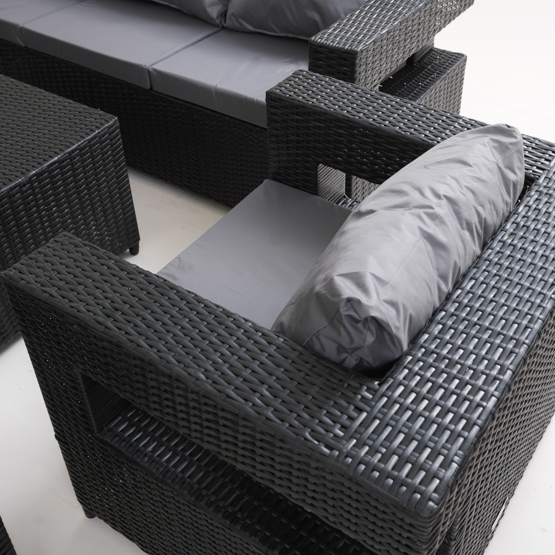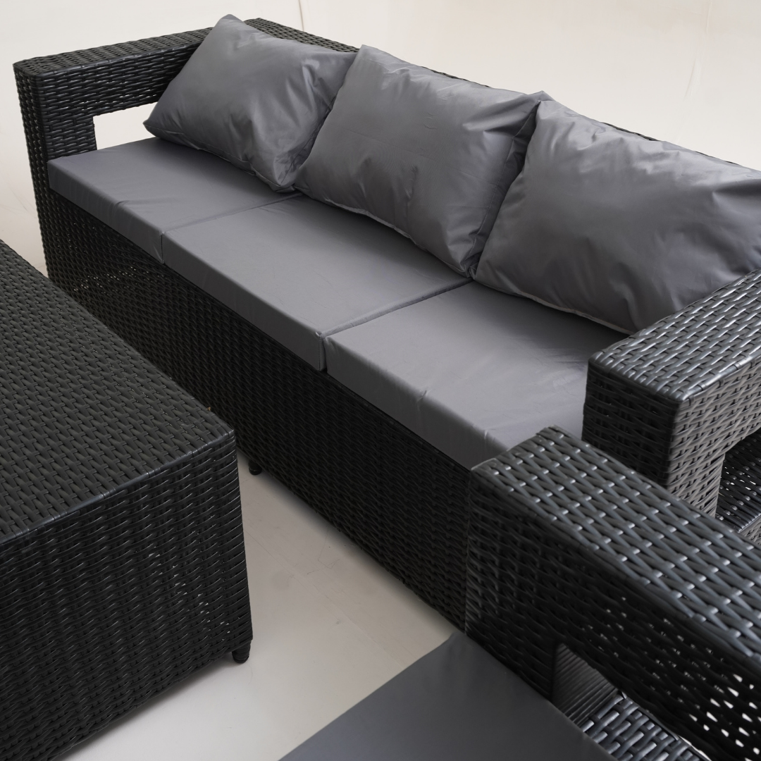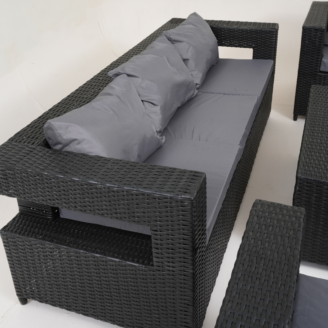 - Experience the pinnacle of outdoor style and comfort with this chic and roomy 8-seater sofa set.